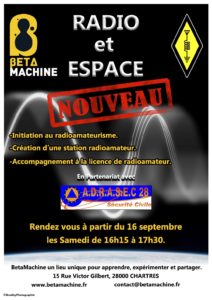 Le samedi 24 juin 2017, l’ADRASEC 28 et BetaMachine signaient une convention de partage mutuel des ressources et de co-animation d’une station radioamateur dans les locaux de BetaMachine. Cette station est destinée aux membres des deux associations qui pourront ainsi partager leurs savoirs et pratiquer leur art en toute convivialité.